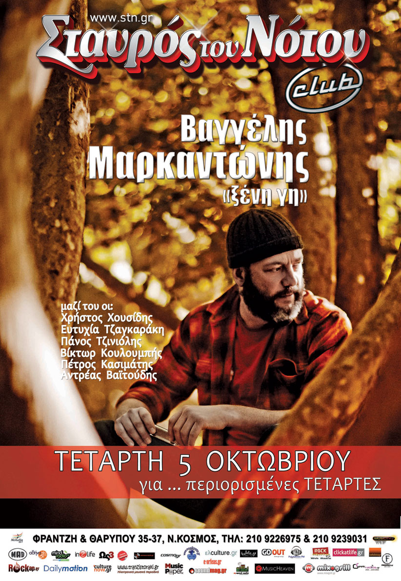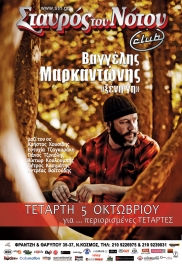 Από τις 5 Οκτωβρίου και μέχρι τέλος Νοεμβρίου, ο Σταυρός του Νότου φιλοξενεί τον νευρώδη, λιτό και ανεβαστικό φολκ ήχο του Βαγγέλη Μαρκαντώνη (πρώην Ανοιχτή Θάλασσα).